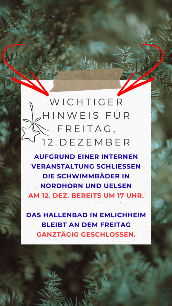 ausgebuchtAm Freitag, 12. Dezember schließen die Hallenbäder in Nordhorn und Uelsen aufgrund einer internen Veranstaltung bereits um 17 Uhr. 🕔