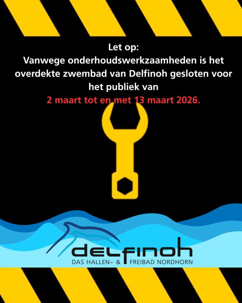 Het binnenbad delfinoh zal dit voorjaar, van maandag 2 maart tot en met vrijdag 13 maart 2026, gesloten zijn voor het jaarlijkse onderhoud.